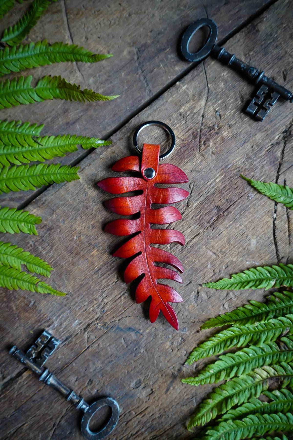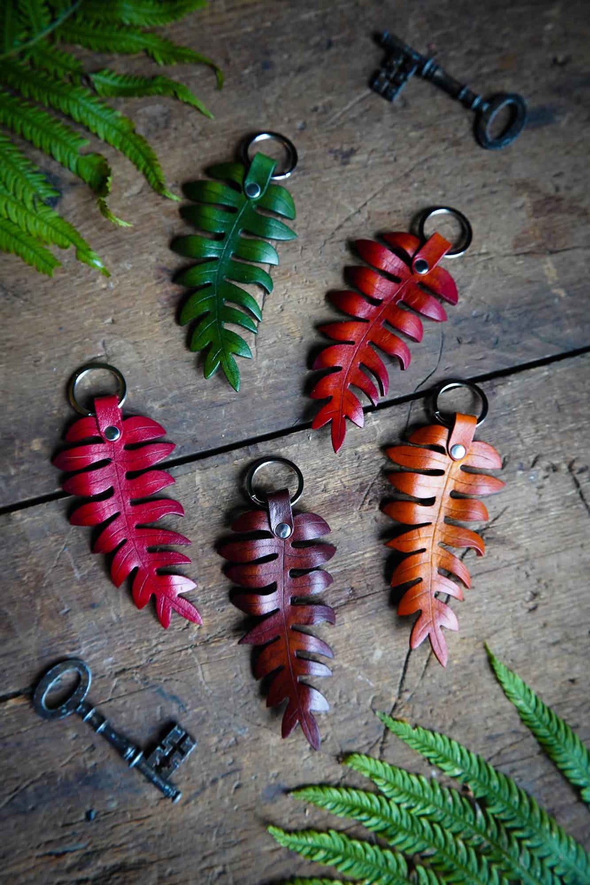 Cut from full grain vegetable tanned leather and hand dyed using water based dyes, each section is then wet molded to create a stunning 3D effect. The fern is then strongly riveted to a steel split ring using a solid brass rivet.