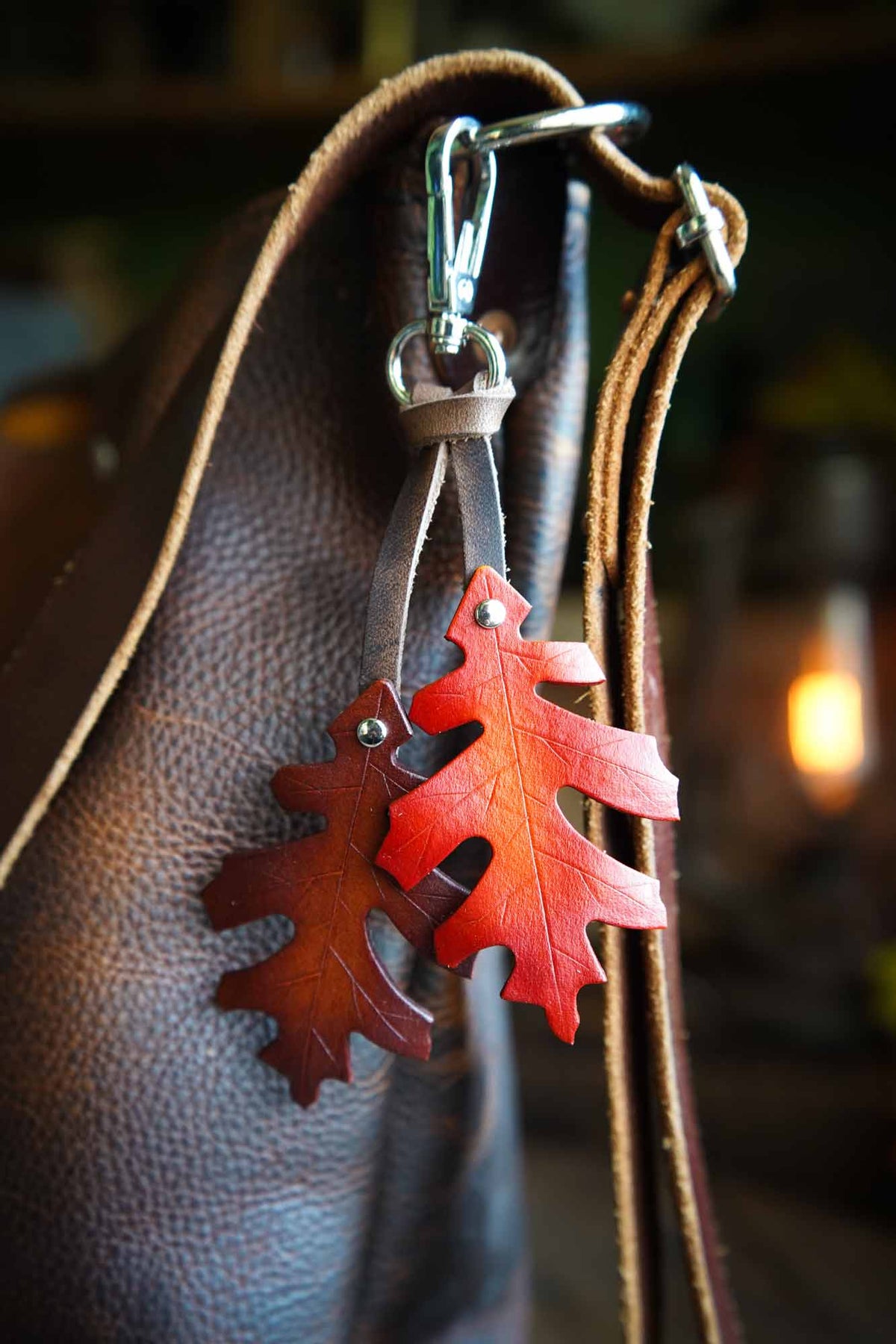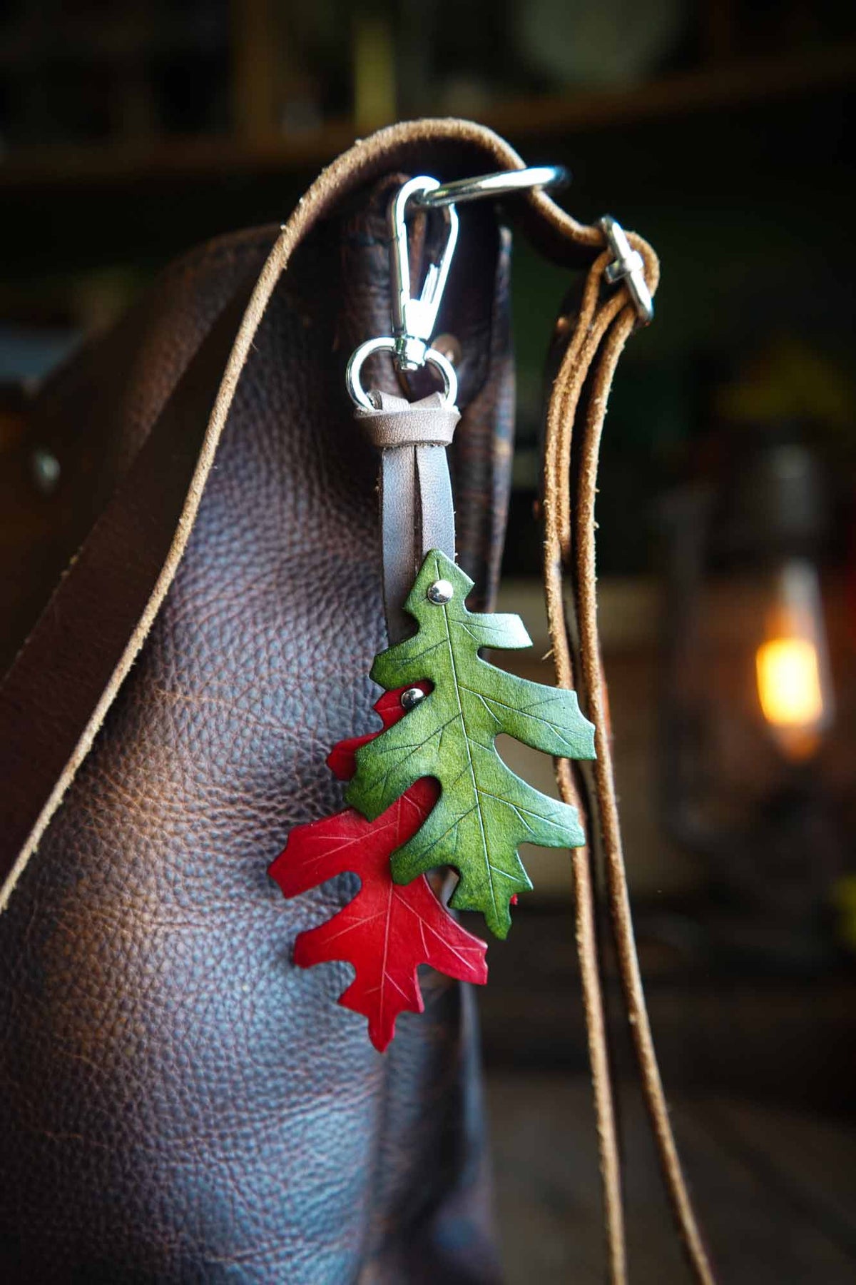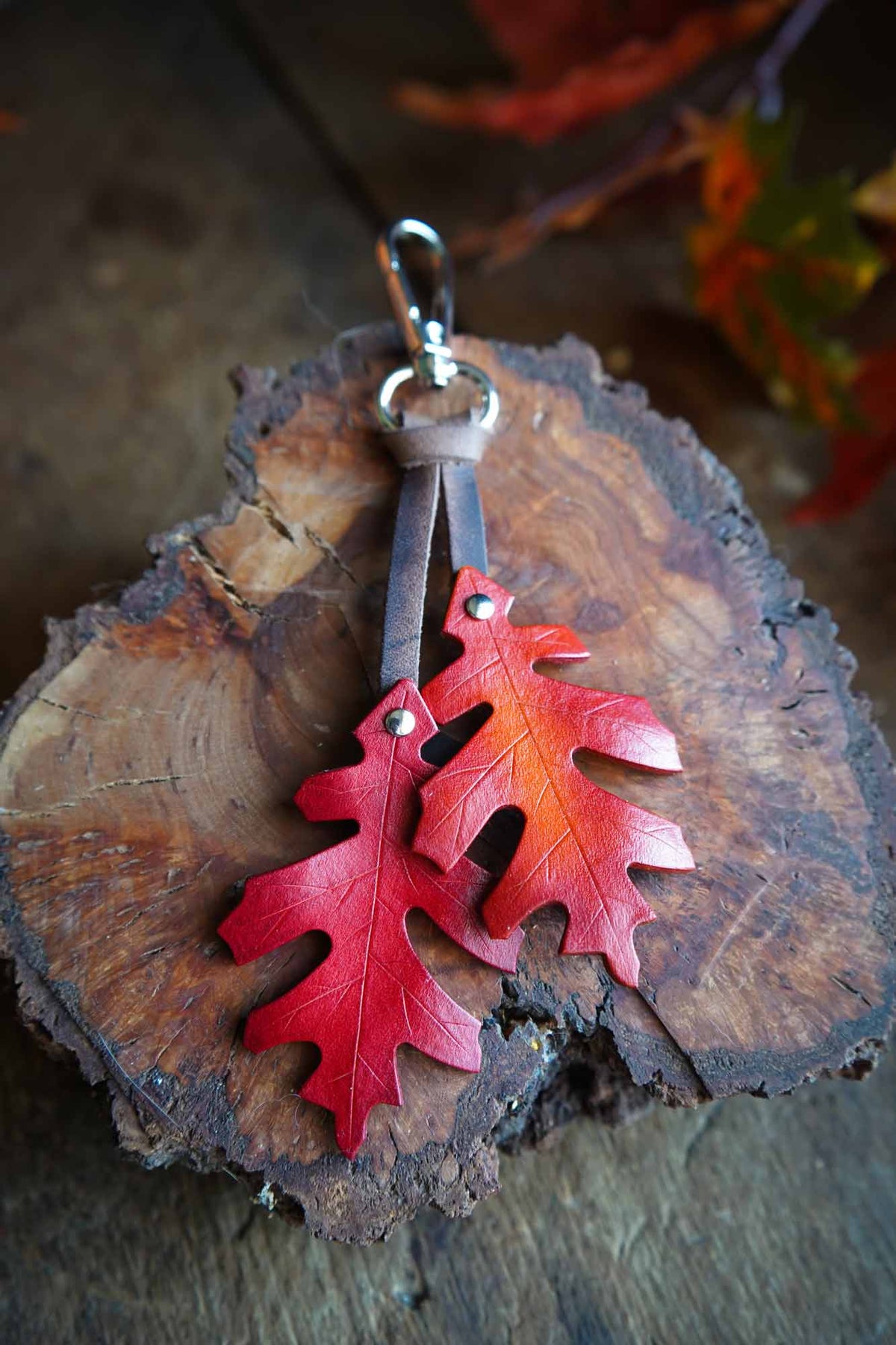 Dress up your bag with a leather red oak leaf bag charm. The perfect seasonal accessory, these uniquely handmade oak leaves will bring a touch of natural magic to your key ring or make a bold bag charm.