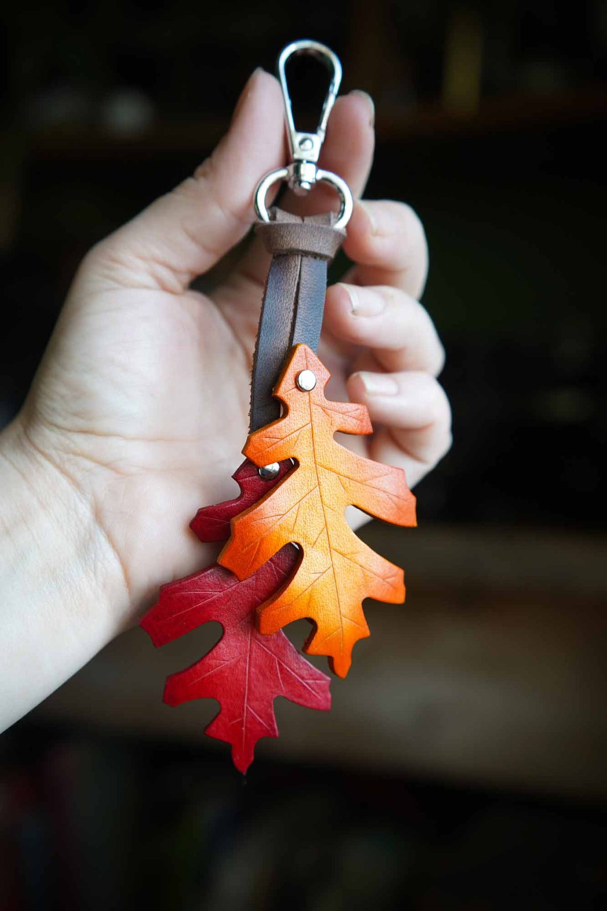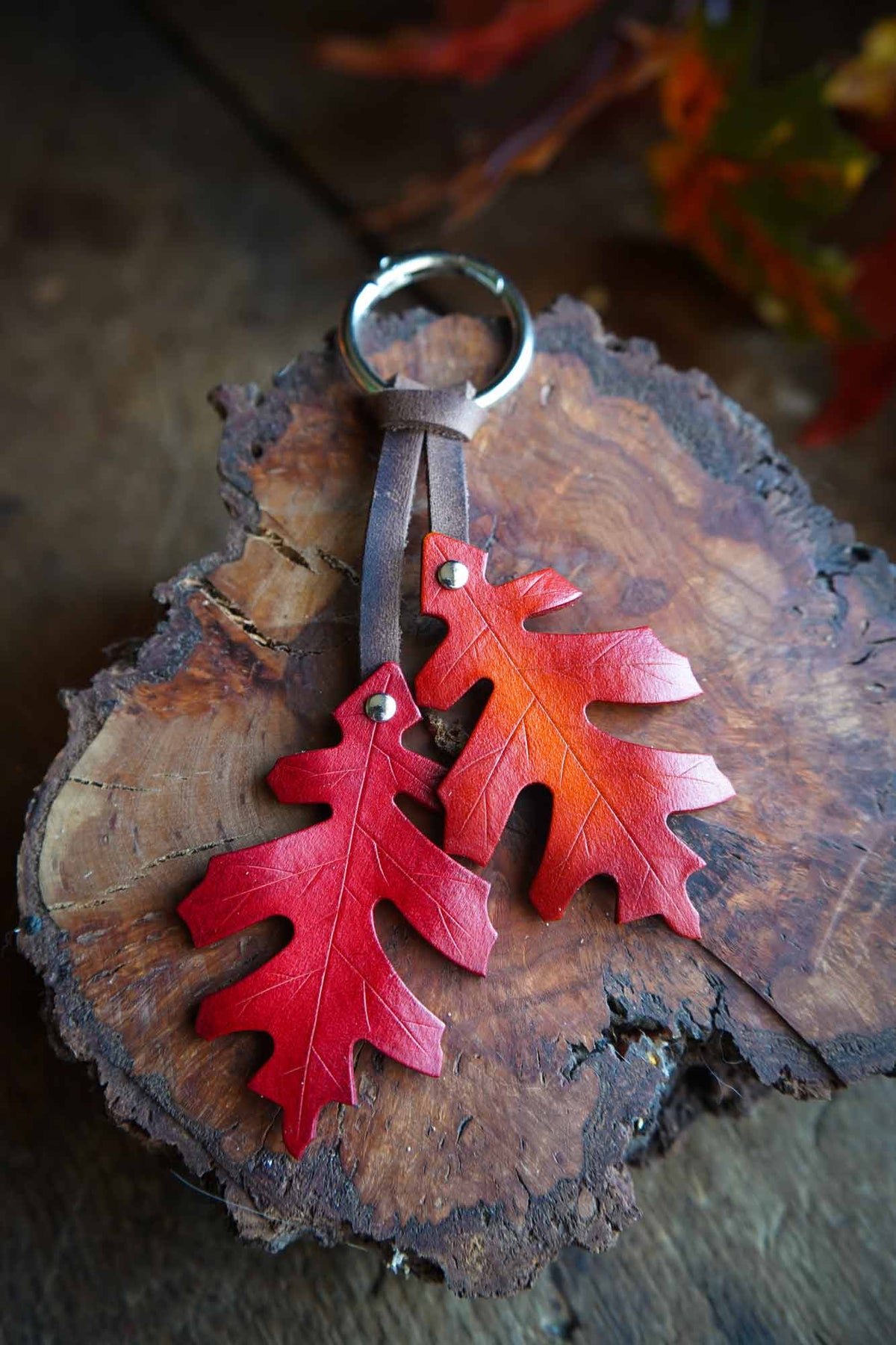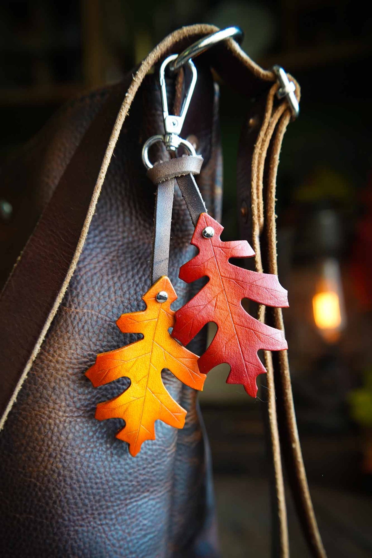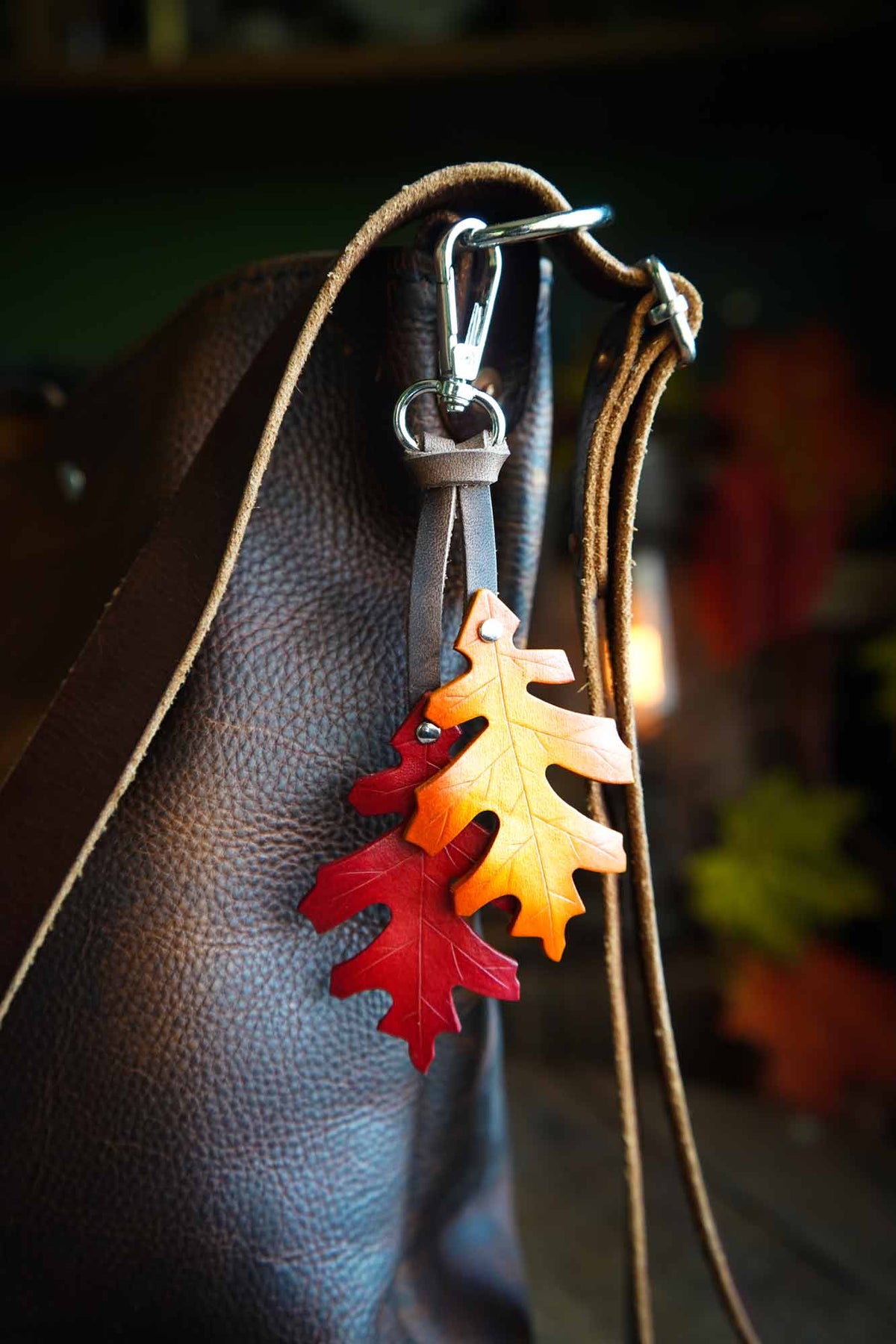 Dress up your bag with a leather red oak leaf bag charm. The perfect seasonal accessory, these uniquely handmade oak leaves will bring a touch of natural magic to your key ring or make a bold bag charm.