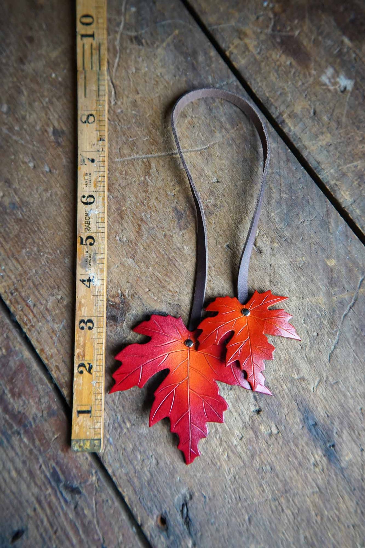 Cut from thick, full grain vegetable tanned leather and hand dyed using water based dyes. Each leaf is shaped and then strongly riveted to leather lace.