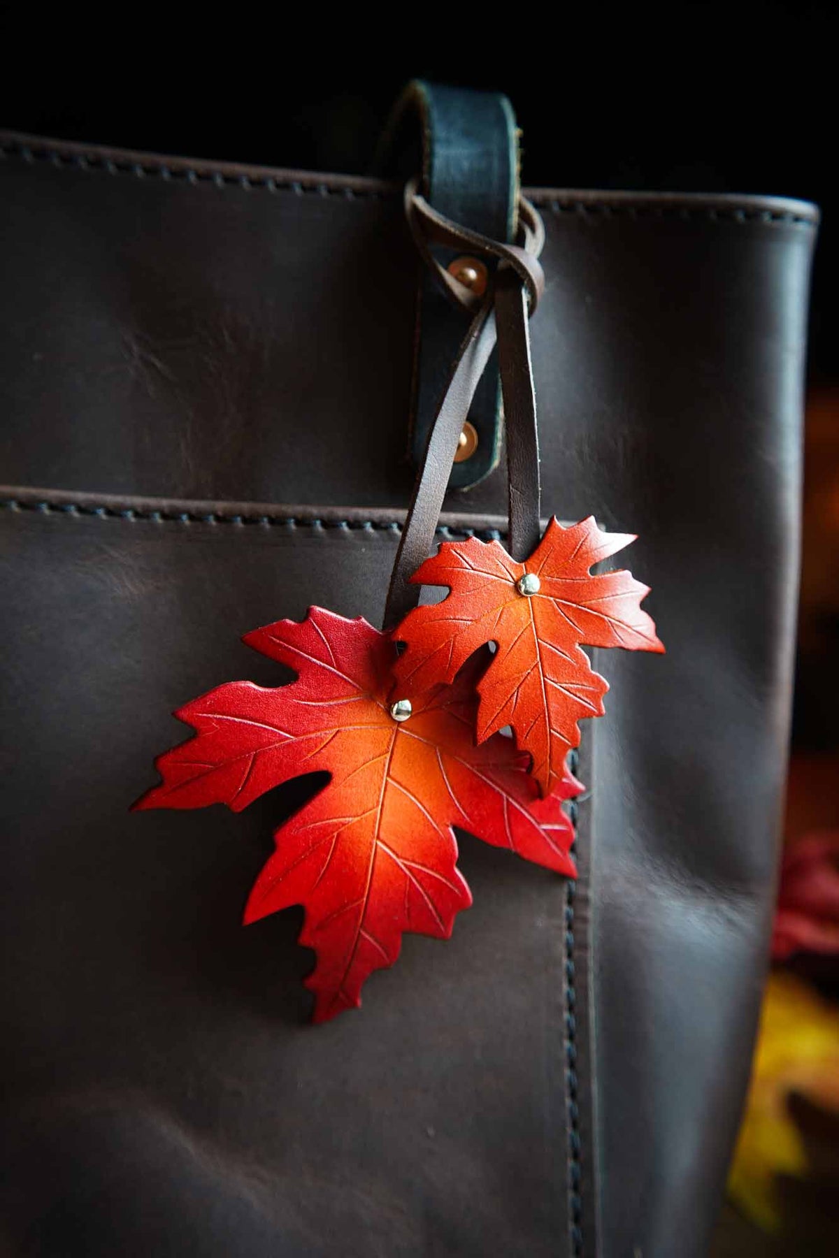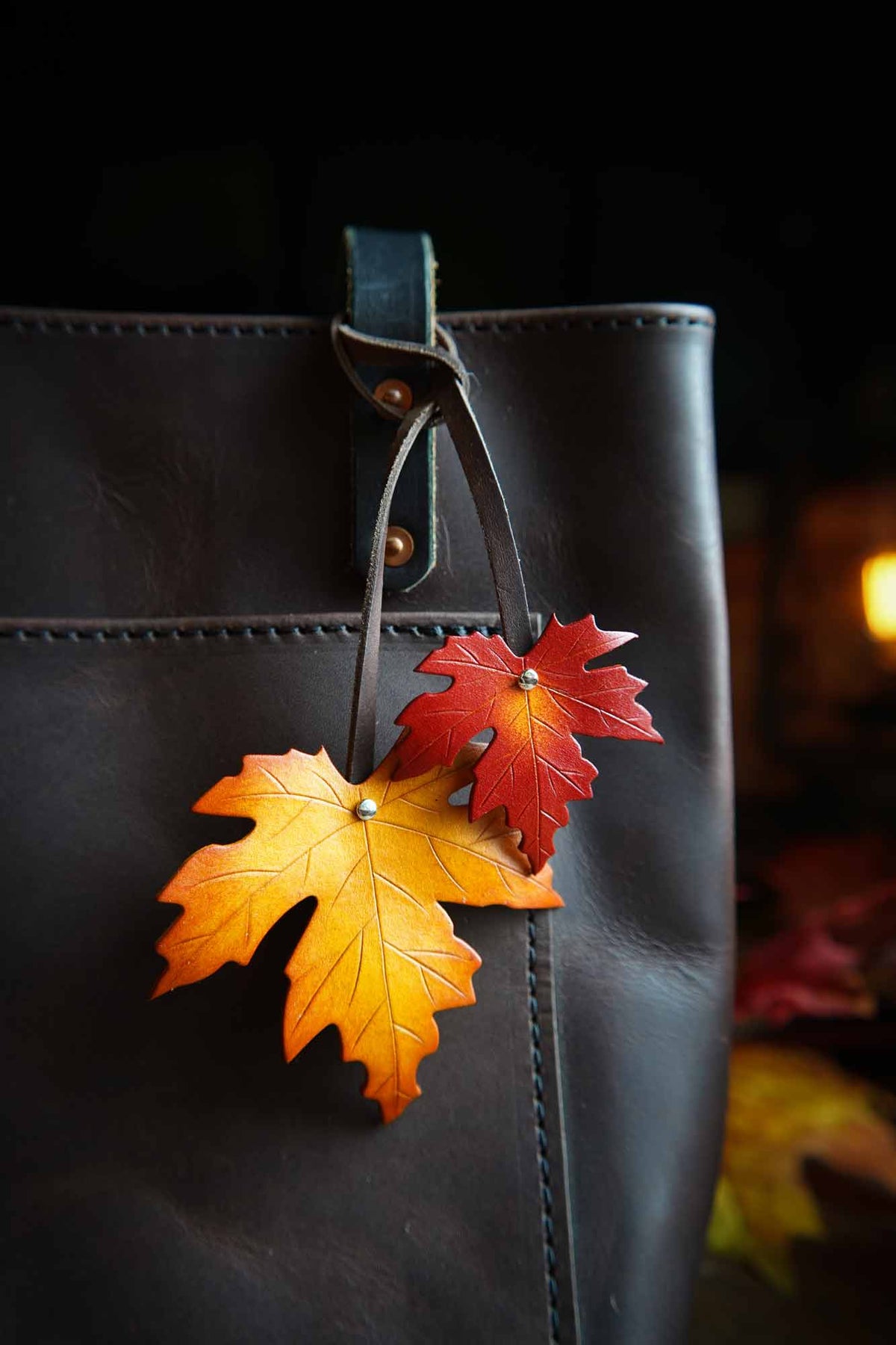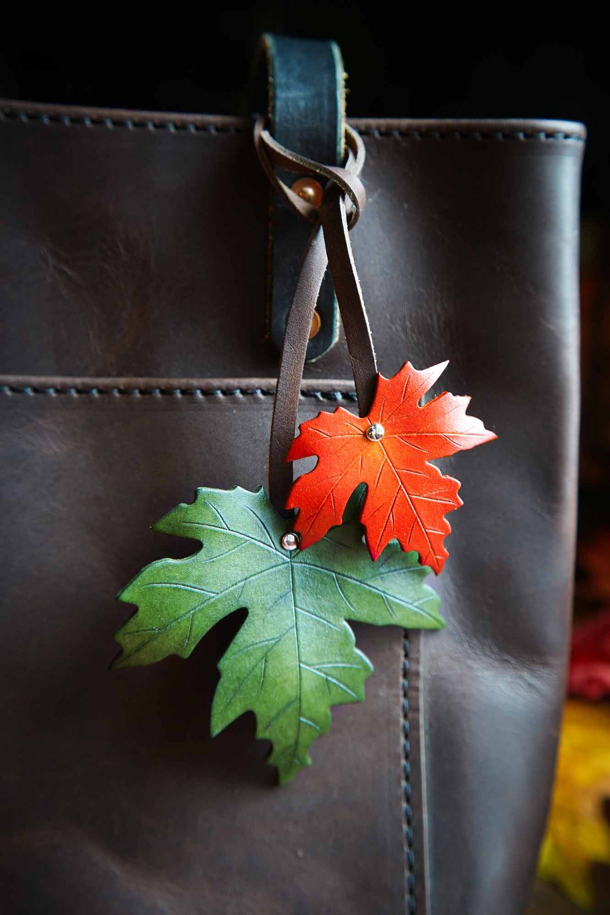 These sugar maple leaf leather bag charms bring the warmth of fall foliage in your choice of colors! The generous leather straps easily loop around the handles of a tote or any accessory ring. The perfect seasonal purse flair, these leather charms are available in a range of autumnal colors to match your daily carry!
