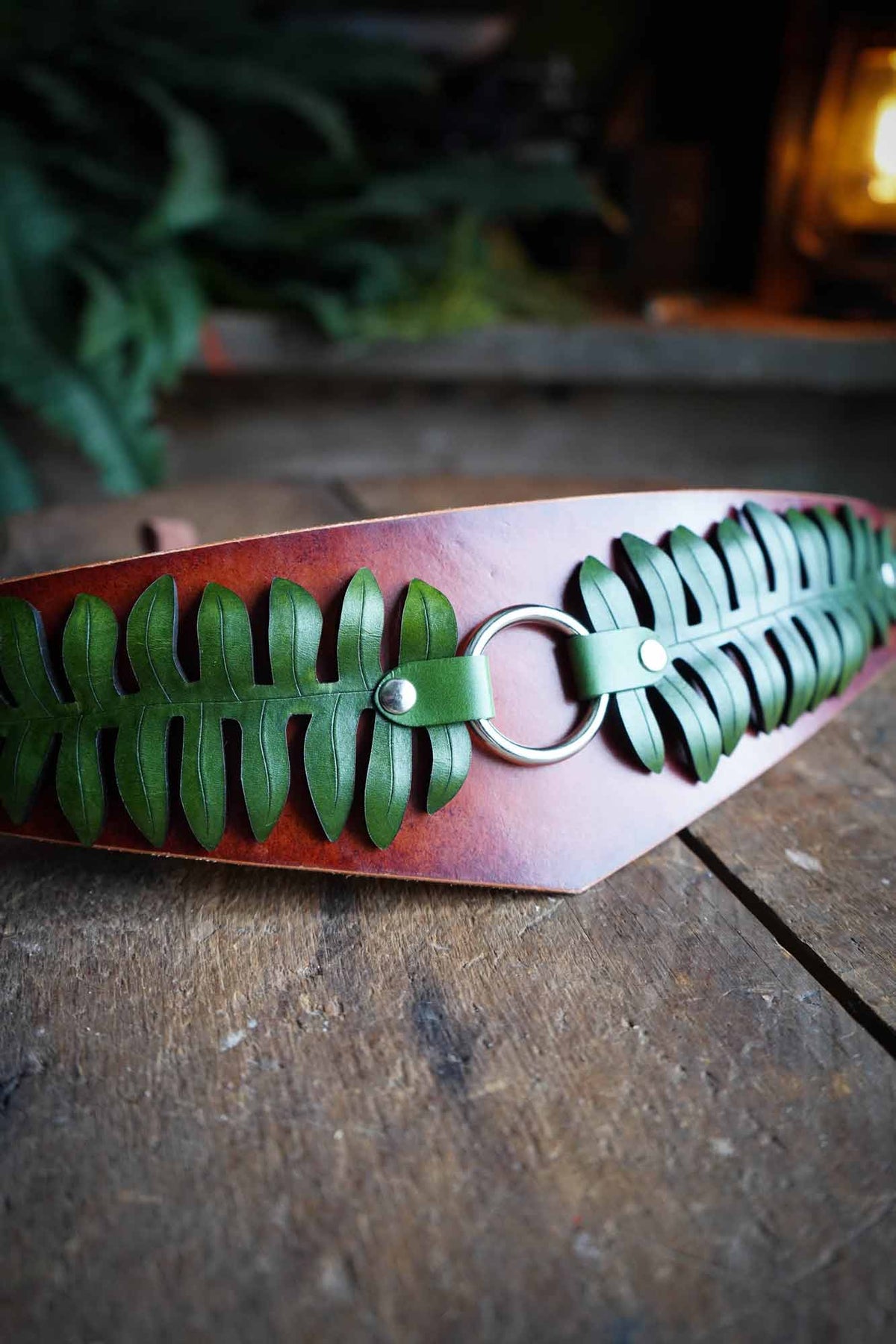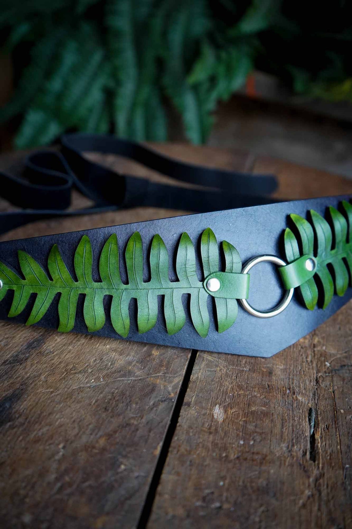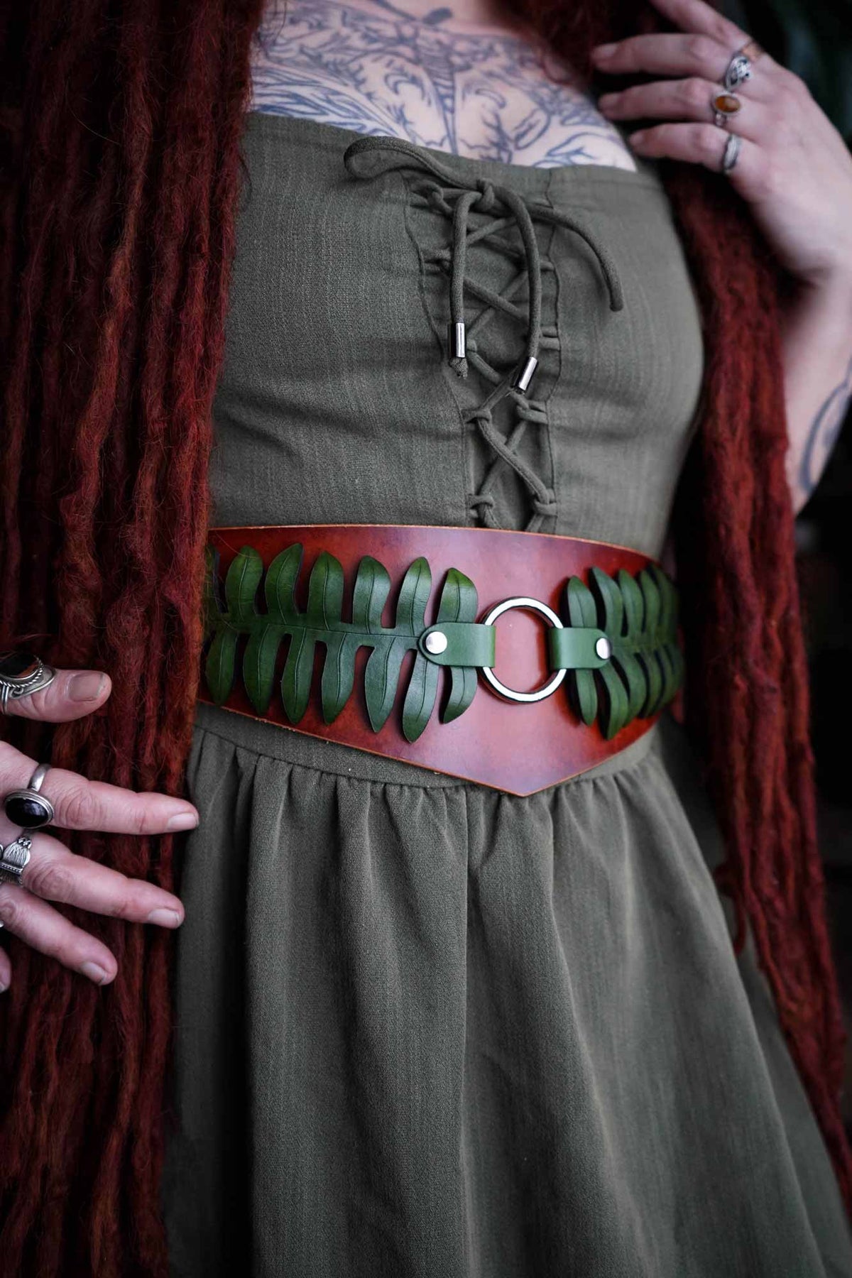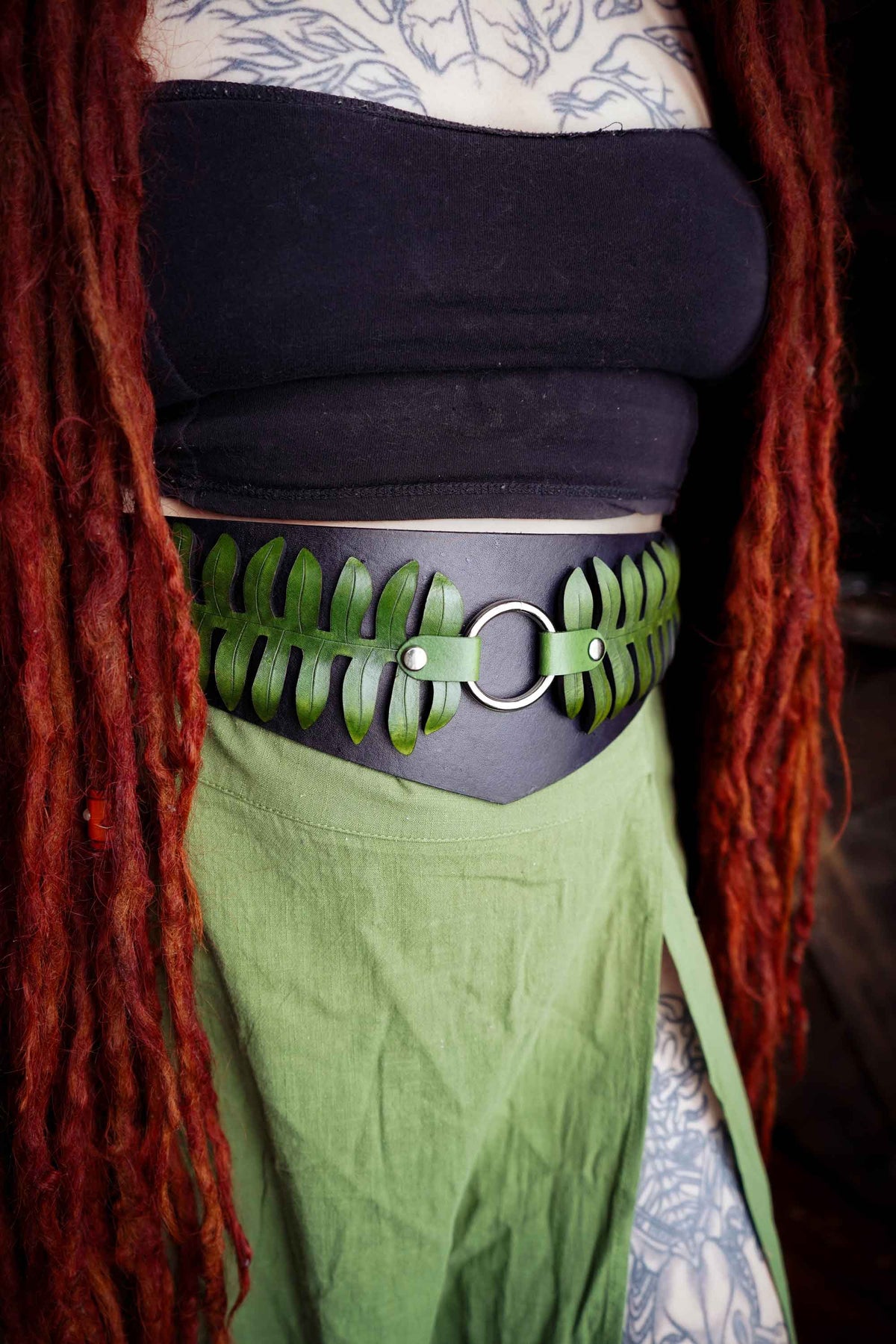 Unfurl your wildest dreams with our Fern Leather Waist Belts. Adorned with hand shaped and dyed realistic looking ferns, these belts will be sure to level up your woodland fantasy outfit! Live your inner bog witch dreams or frolic with the faeries at the renaissance faire.