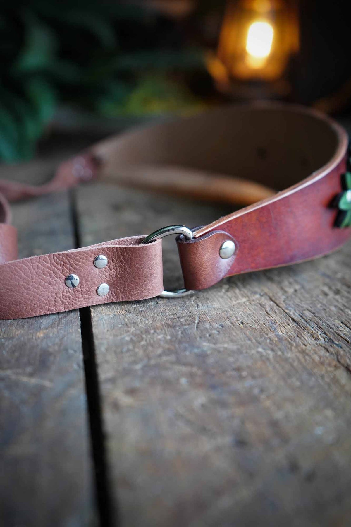 Each belt will feature a set of hand crafted gorgeous green ferns placed on your choice of a brown or black belt. These beautiful handcrafted belts are anchored together with a thick steel ring and solid brass rivets. The soft yet sturdy leather ties allow for a free flowing fit.
