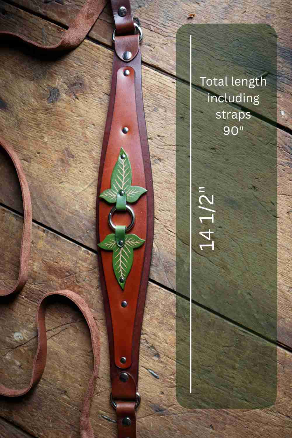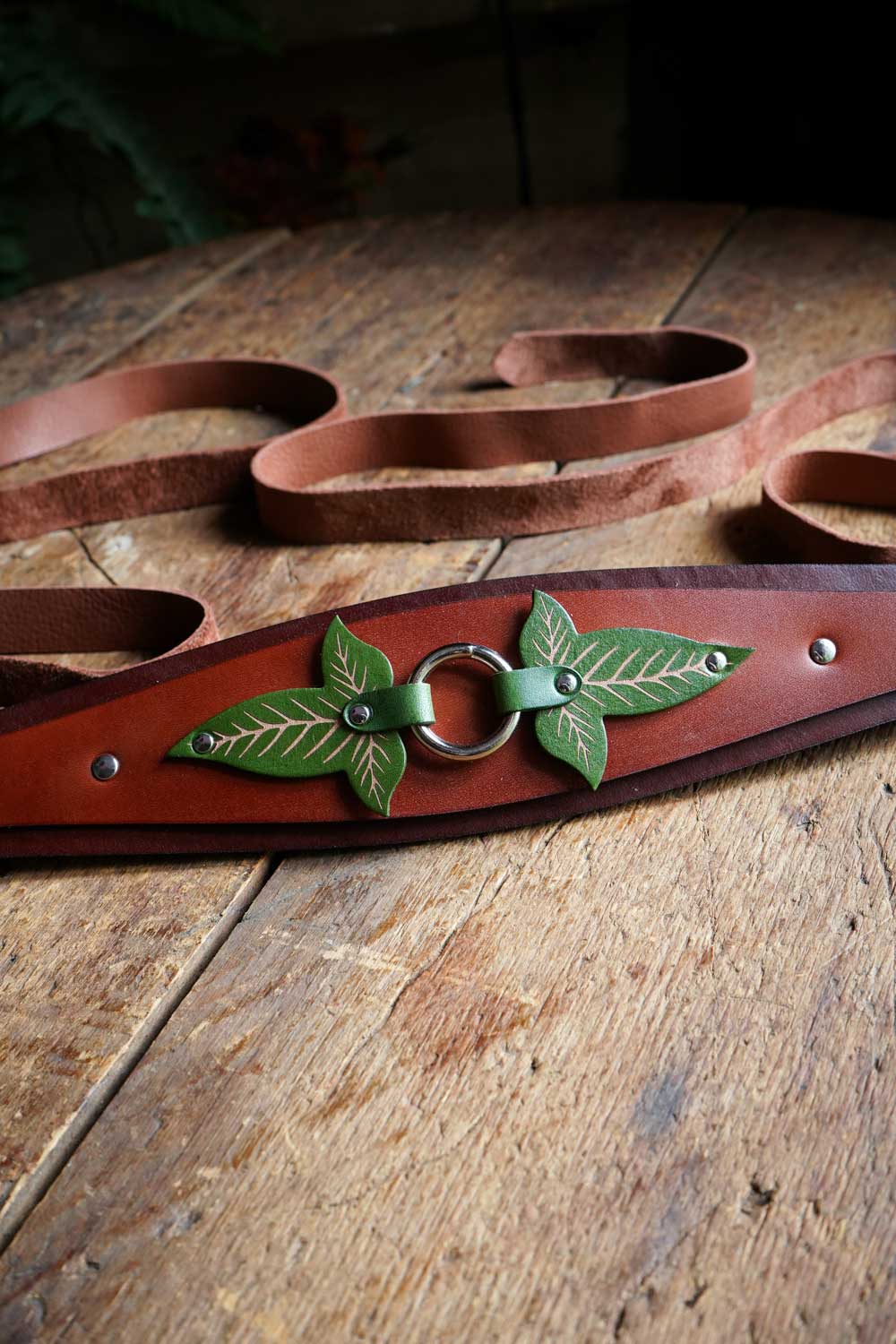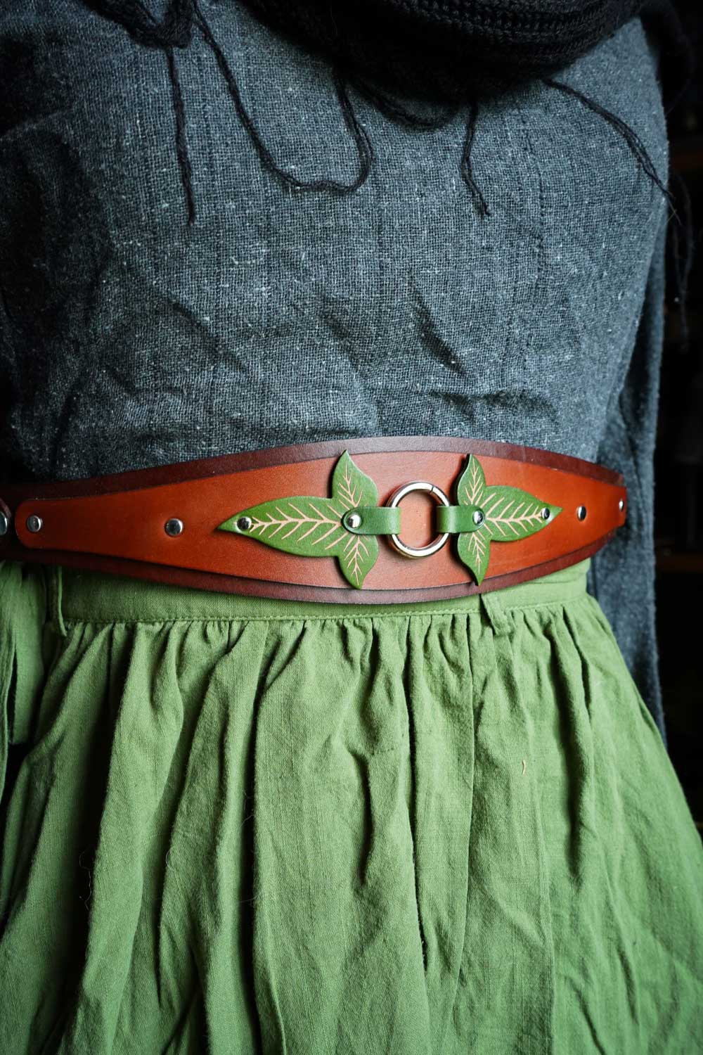 Each belt will feature a set of hand crafted gorgeous green elven leaves. These beautiful handcrafted belts are anchored together with a thick steel ring and solid brass rivets. The soft yet sturdy leather ties allow for a free flowing fit.