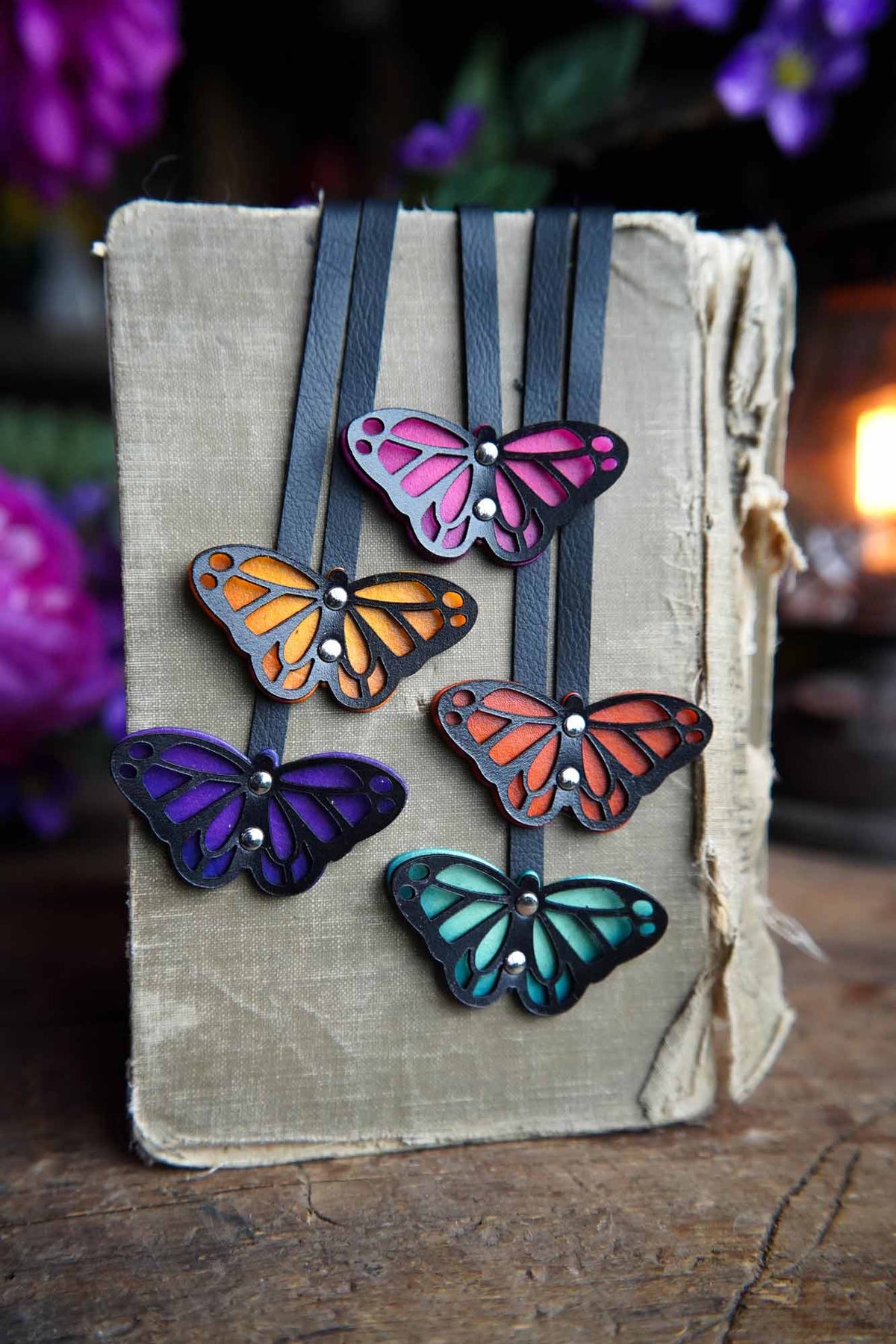Introducing our stunningly vibrant leather butterfly bookmark, the perfect accessory to add a touch of whimsy to your reading routine. The intricate wing cut outs allow the bold hand dyed colors to show through creating a lovely layered effect.