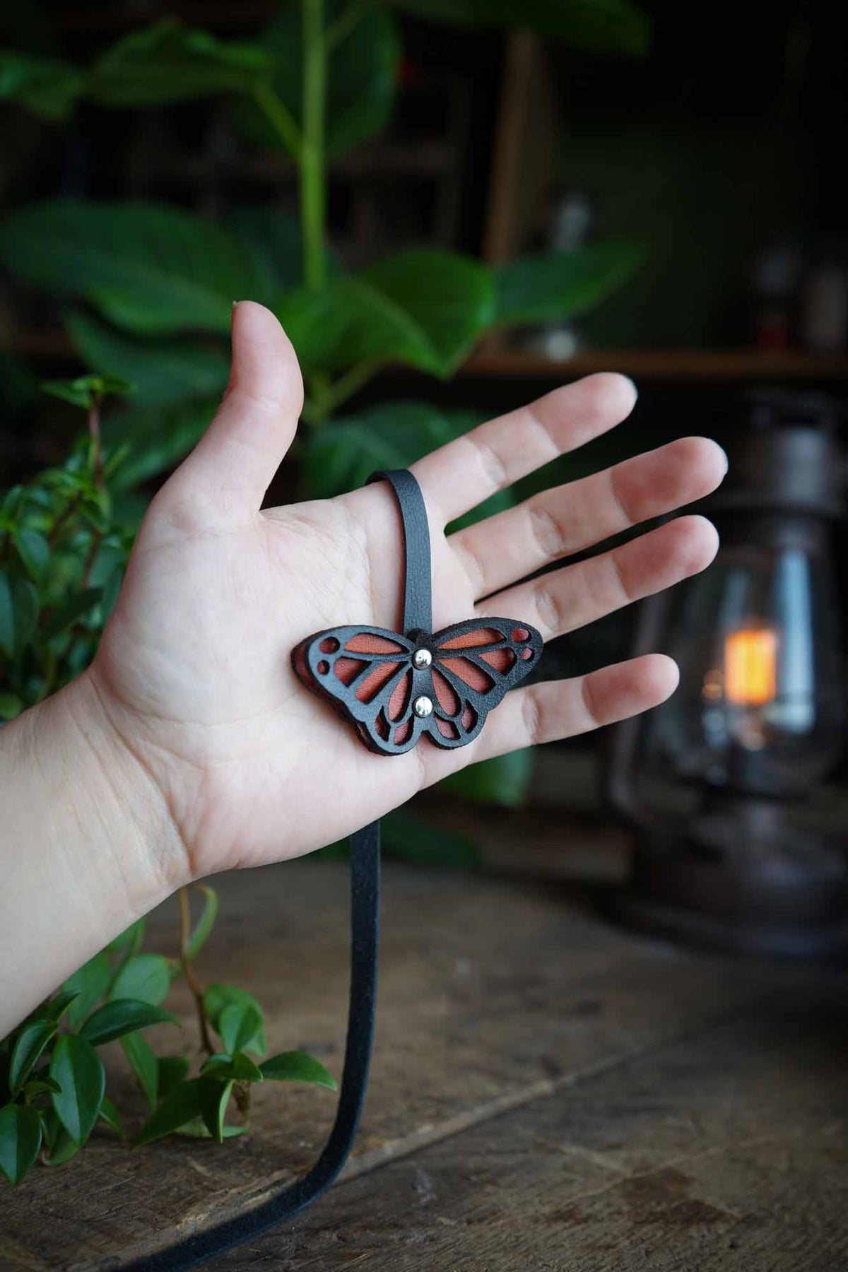 The butterfly itself is made with vegetable tanned leather while the lace will be a lighter weight upholstery or garment leather in black. The leather used will vary as we source it from factory remnants giving new life to these valuable textiles.