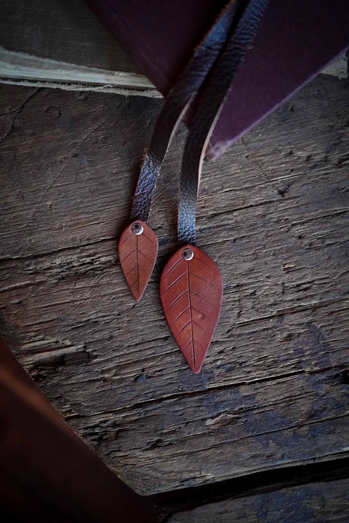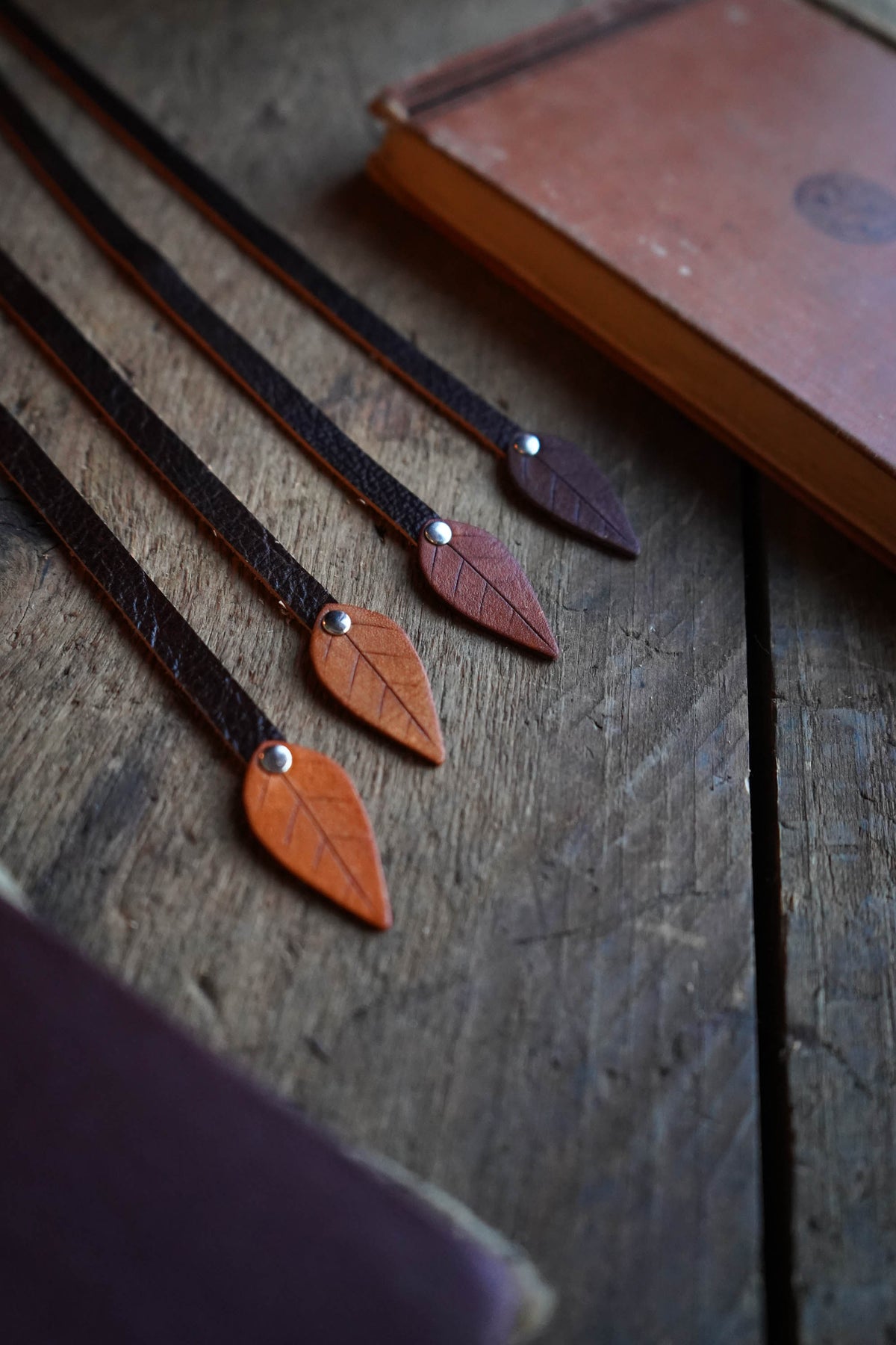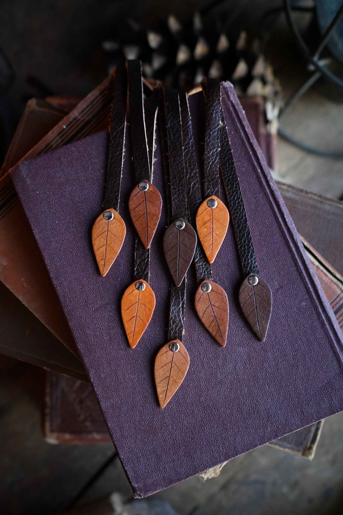 The rich browns of fall bring a warmth to our handcrafted leather leaf bookmark lineup.